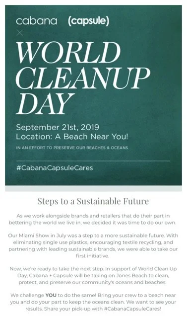 After rebranding Cabana & Capsule through a sustainability-focused lens, we decided we needed action to speak to our new message. To do so, I created an email campaign to invite our brand portfolio to Worldwide Clean Up Day, where they were invited to clean up a beach near them. Across the globe, we ended up collecting over 10,000 pounds of waste!
